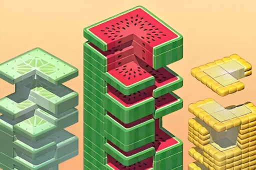 Block Stacking is a puzzle game that challenges your logical thinking skills as you strategically adjust block positions and directions to eliminate layers of blocks horizontally and clear the screen of fruits.